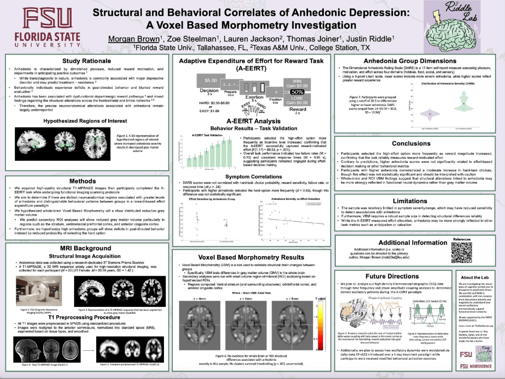Brown, M. A., Steelman Z., Jackson L. M., Joiner T. M. Riddle J. M. (2026, April) Structural Correlates of Anhedonic Depression: A Whole-Brain Voxel-Based Morphometry Investigation. FSU Undergraduate Research Symposium, Tallahassee, FL.